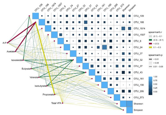 We further analyzed the correlations between the important ruminal microbes and ruminal fermentation parameters and found seven clinical indicators were closely related to the important ruminal microbes (Figure 3, the absolute values of spearman’s r > 0.1 and p < 0.05). The Prevotellaceae were positively correlated with isovalerate (r = −0.25). The correlations were observed between Prevotellaceae and three parameters: Prevotellaceae had relatively higher negative correlations with acetate: propionate (r = −0.32) than with acetate (r = −0.3) and significant positive correlation with propionate (r = 0.28). Of the identified bacterial biomarkers by the random forest regression model, both Ruminococcaceae and Oribacterium were negatively associated with isobutyrate, isovalerate, and valerate. Additionally, a negative correlation between Ruminococcaceae and butyrate (r = −0.26) was observed.