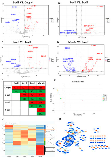 Dynamics of lncRNAs during rabbit pre-implantation development. (A–D) DE lncRNAs between consecutive stages: oocyte and 2-cell, 2-cell and 4-cell, 4-cell and 8-cell, 8-cell and morula; log(padj) (logarithm (adjust p-value)). Five lncRNAs up- or down-regulated with the lowest p-Value are labeled in the volcano plot, and their Ensembl ID ENSOCUG000000***** are abbreviated as E*****. For instance, E39189 represents ENSOCUG00000039189. (E) Number of DE lncRNAs between consecutive stages. (F) Principal component analysis of all identified lncRNAs; PCA (Principal component analysis); Dim1: (dimension1); Dim2 (dimension2). (G) Expression changes of DE lncRNAs analyzed using the k (clustering method); C (cluster). (H) Network diagram of co-expression analysis between lncRNAs and mRNAs (|Spearman correlation| ≥ 0.98).
