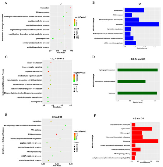 GO and KEGG analyses of DE lncRNA. (A,C,E) The top 10 significantly enriched terms of biological process (p < 0.05). (B,D,F). The top 10 significantly enriched KEGG pathways (p < 0.05). C1–C6: (cluster 1 to cluster 6) identified by k (clustering method from previous analysis). GO (Gene Ontology). KEGG (Kyoto Encyclopedia of Genes and Genomes).