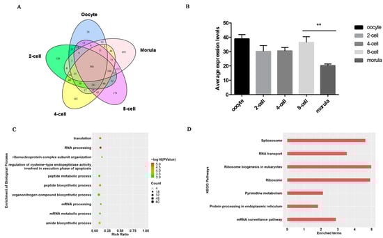 Maternal clearance is one of the major molecular activities in pre-implantation embryos. This study further analyzed the expression changes of maternal lncRNAs to assess if maternal lncRNAs undergo extensive degradation during MZT. The number of expressed lncRNAs at each stage was counted and analyzed. Each stage had some exclusively expressed lncRNAs (Figure 3A). Approximately 500 lncRNAs were exclusively expressed in morula, more than the sum of that in the four first stages, suggesting that abundant zygotic lncRNAs were transcribed in morula embryos. Interestingly, up to 588 lncRNA, half of the maternal lncRNAs, showed expression across the five stages. The study then analyzed the average expression of these lncRNAs and found that these lncRNAs had relatively stable expression levels in the four first stages and significantly decreased the expression levels at morula stage (Figure 3B, p < 0.01). The study also predicted the potential target genes of these late-degraded lncRNAs (|Spearman correlation| ≥ 0.95, Table S3). The top 10 significantly enriched terms were highly related to translation, RNA processing, peptide metabolic/biosynthesis process, organonitrogen compound biosynthetic process, amide biosynthetic process, etc., (p < 0.05). KEGG analysis showed that these lncRNAs were mainly involved in pathways of spliceosome, RNA transport, ribosome, pyrimidine metabolism, protein processing in endoplasmic reticulum, and mRNA surveillance pathway (Figure 3C,D, p < 0.05).