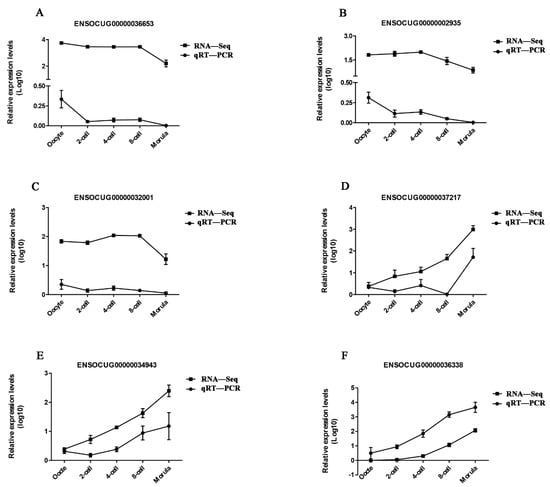 Validation of six DE lncRNAs including ENSOCUG0000036653 (A), ENSOCUG0000002935 (B), ENSOCUG0000032001 (C), ENSOCUG0000037217 (D), ENSOCUG0000034943 (E) and ENSOCUG0000036338 (F) by RT-qPCR.