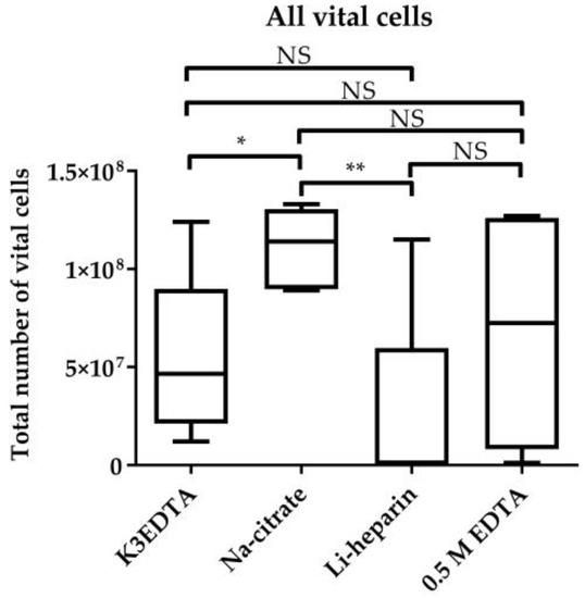Blood sampling in commercial Na–citrate tubes revealed the highest count of vital cells (1.11 × 108) compared to commercial K3EDTA (5.37 × 107) (p < 0.05) and heparin (2.42 × 107) (p < 0.01) tubes (Figure 1). We found no significant difference between blood sampling in commercial Na–citrate tubes and 200 µL 0.5 M EDTA (6.81 × 107).
