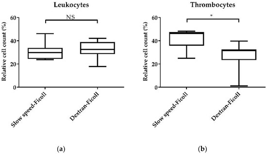 Yield of leukocytes and thrombocytes using two immune cell isolation methods, combined slow-speed-ficoll and dextran–ficoll separation. After PBMC isolation, immune cells were stained with the pan-leukocyte marker CD45 and the thrombocyte marker CD41/CD61 and subjected to flow cytometry. (a) Leukocytes and (b) thrombocytes relative to the total live cell count. A total of 20,000 vital lymphocytes were recorded on a BD Canto II flow cytometer. DAPI was used as a viability marker. Data represent seven biological replicates and two technical replicates, each in two independent experiments. A box-and-whisker plot is displayed. Significance is shown as *, p < 0.05. NS: not significant. Significance was analyzed using an unpaired Student’s t-test.