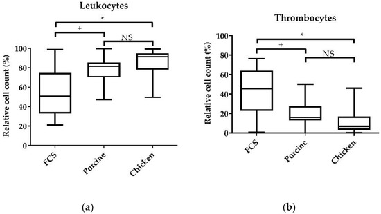 Influence of the addition of different sera to the cell culture on the survival of immune cells. Isolated PBMCs were cultured in RPMI-1640 medium with glucose, 100 U/mL penicillin, 100 µg/mL streptomycin, and either 10% chicken, 10% porcine, or 10% FCS. The relative cell counts of leukocytes and thrombocytes were assessed after 24 h of cultivation. (a) CD45-high leukocytes, relative to the vital lymphocyte population; (b) CD45-low thrombocytes relative to the vital lymphocyte population. A total of 20,000 cells were recorded on a BD Canto II flow cytometer. DAPI was used as a viability marker. Data represent seven biological replicates and two technical replicates each. A box-and-whisker plot is displayed. Significance is shown as +, p < 0.1; *, p < 0.05. NS: not significant. Significance was analyzed using an unpaired Student’s t-test.