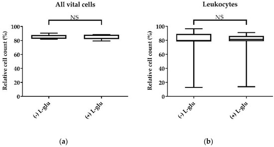 The effect of additional L-glutamine on cell viability. Isolated chicken PBMCs were cultured in RPMI-1640 medium with glucose, 100 U/mL penicillin, 100 µg/mL streptomycin, and 10% chicken serum with or without additional L-glutamine (2 mM) for 24 h. (a) Vital cells relative to the lymphocytes; (b) CD45-high leukocytes, relative to the vital lymphocyte population. A total of 20,000 cells were recorded on a BD Canto II flow cytometer. DAPI was used as a viability marker. Data represent seven biological replicates and two technical replicates each. A box-and-whisker plot is displayed. NS: not significant. Significance was analyzed using an unpaired Student’s t-test.