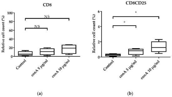 Effects of conA on CD8+ cytotoxic T-cells and CD4+ T-helper cells. The effects of two concentrations (5 µg/mL and 10 µg/mL) of conA on the activation and proliferation of cytotoxic T-cells and T-helper cells relative to the vital lymphocyte population were assessed after 24 h of cultivation. (a) CD8+ cytotoxic T-cells; (b) CD8+CD25+ activated cytotoxic T-cells; (c) CD4+ T-helper cells; (d) CD4+CD25+ activated T-helper cells. A total of 20,000 cells were recorded on a BD Canto II flow cytometer. DAPI was used as a viability marker. Data represent four biological replicates and two technical replicates each. A box-and-whisker plot is displayed. Significance is shown as +, p < 0.1; *, p < 0.05. NS: not significant. Significance was analyzed using an unpaired Student’s t-test.