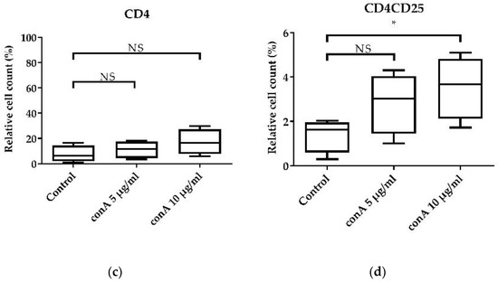 As expected, conA treatment increased the relative cell count of CD8+ cytotoxic T-cells (Figure 5a), although the result was not significant. However, at a concentration of 10 µg/mL, conA increased the mean of the relative cell count of CD8+CD25+ activated cytotoxic T-cells from 0.29% to 1.32% (p < 0.05) (Figure 5b). For T-helper cells, conA stimulation increased the relative cell count of CD4+ T-helper cells numerically (Figure 5a), but this also did not reach significance. However, looking at CD4+CD25+ activated T-helper cells, conA treatment in a concentration of 10 µg/mL increased the mean relative cell count from 1.40% to 3.54% (p < 0.05) (Figure 5d). These effects were visible for two different organs, blood (Figure 5) and spleen (data not shown).