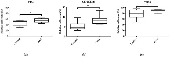 As shown by testing two different conA treatment concentrations on PBMCs (Figure 5), the validation of the effect of 10 µg/mL conA on PBMCs by testing more biological replicates produced similar results (Figure 6 and Figure S3). ConA treatment increased the mean relative cell count of CD4+ T-helper cells significantly from 46.93% to 54.81% (p < 0.05) (Figure 6a and Figure S3a,d). Furthermore, conA increased the mean relative cell count of CD4+CD25+ activated T-helper cells from 5.33% to 8.44% (p < 0.01) (Figure 6b and Figure S3b,d). Moreover, the mean relative cell count of CD28+ T-cells increased significantly after conA treatment from 76.79% to 88.54% (Figure 6d and Figure S3c,e), indicating T-cell proliferation.