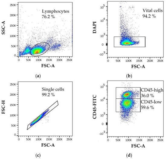 To assess the percentage of immune cell subsets, the following gating strategy was used (Figure 7a–d). First, lymphocytes were gated with a SSC/FSC plot (Figure 7a). From the lymphocyte population, only live cells were considered for further analysis (Figure 7b). Doublets were gated out (Figure 7c). Immune cell subsets were analyzed with antibodies labeling leukocytes (CD45-FITC), thrombocytes (CD41/CD61-(R)PE), T-helper cells (CD4-SPRD), cytotoxic T-cells (CD8-APC), T-cells (CD28-PE and CD3-APC), and activated T-cells (CD25-FITC) (example CD45-FITC; Figure 7d and Table 1).