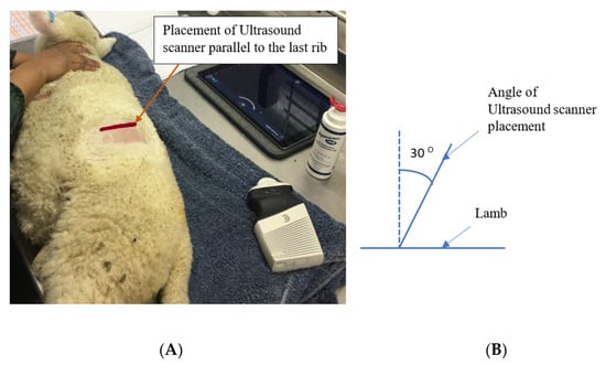 Ultrasound scanning of each lamb’s rumen was performed at experimental weeks five (36 ± 1.2 d of age) and seven (49 ± 1.2 d of age). Scanning was undertaken with the lamb lying on its right side, using a Clarius portable ultrasound scanner with a 3.0–7.0 MHz convex transducer and maximum penetration depth of 20 cm (Clarius, Gilmore way, Burnaby, Canada). The wool was clipped from the area on the dorsal left side, just caudal to the last rib, to the end of the transverse process of the last lumbar vertebrae. The rumen was examined caudal to the last rib by placing the ultrasound scanner parallel to the last rib with approximately a 30° angle from the zenith (Figure 1), after application of transmission gel (Aquasonic, Parker laboratories Inc., Fairfield, New Jersey, NY, USA). Images were then captured and the thickness of the rumen wall was measured (9 measurements per lamb) by FIJI imageJ software (National Institutes of Health, Bethesda, MD, USA) [].