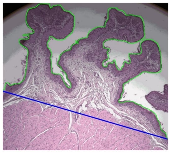 The length of papillae outer boundary of the stratum corneum (green line) and the respective straight length of rumen tissue (blue line) measured in dorsal and ventral sites of rumen by FIJI ImageJ software, to calculate the ratio between length of papillae surface/straight length of rumen tissue (PSL/STL) of lambs.