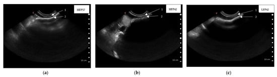 Ultrasound scanned images showing rumen wall thickness captured caudal to the last rib by placing the Clarius ultrasound scanner (3.0–7.0 MHz) parallel to the last ribs of seven-week (49 ± 1.2 d)-old lambs ((a) HFP57, high fibre concentrate pellet and milk feeding to 57 d of age; (b) HFP42, high fibre concentrate pellet and weaning at 42 d of age; (c) LFP42, low fibre concentrate pellet and weaning at 42 d of age) lying on its right side, 1. Abdominal wall, 2. Rumen wall.