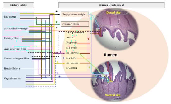 Schematic diagram of correlations between dietary factors and rumen development parameters of artificially reared lambs given three rearing treatments (significant (p < 0.05) positive influence and tended positive influence). The parameters combined into a same-colour line influence the respective rumen development parameter (e.g., all parameters joined to the black-coloured solid line positively influenced the empty rumen weight).