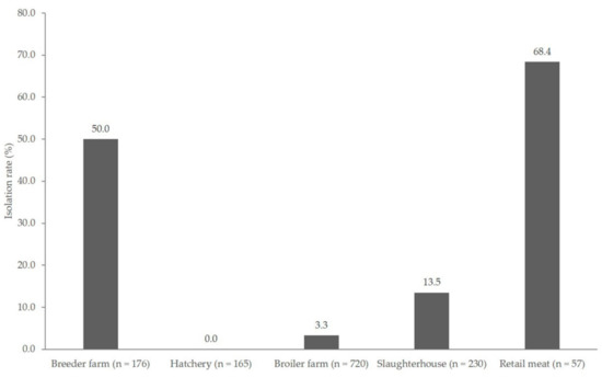 - Choi, S.W.; Ha, J.S.; Kim, B.Y.; Lee, D.H.; Park, J.K.; Youn, H.N.; Hong, Y.H.; Lee, S.B.; Lee, J.B.; Park, S.Y.; et al. Prevalence and characterization of Salmonella species in entire steps of a single integrated broiler supply chain in Korea. Poult. Sci. 2014, 93, 1251–1257. [Google Scholar] [CrossRef]
