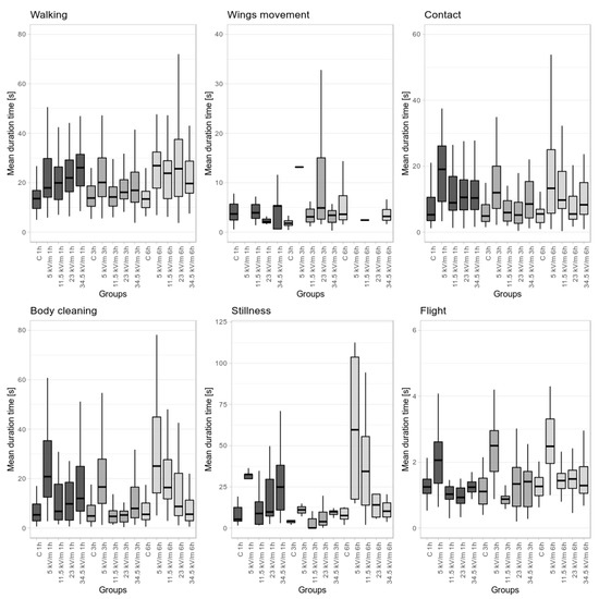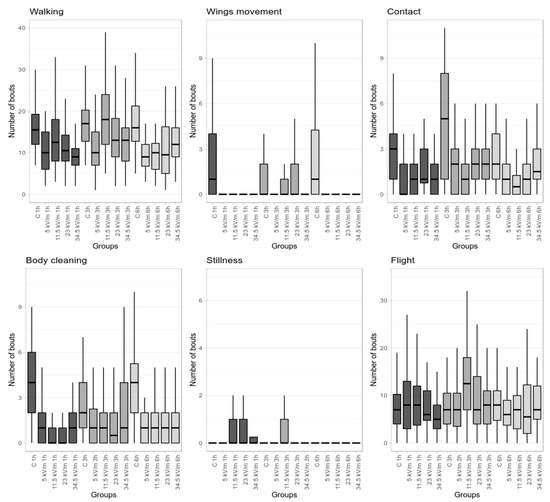 In the 11.5 kV/m 1 h, 3 h, and 6 h groups, all types of behavior were observed (see Figure 1 and Figure 2 and Table 1 and Table 2). Similarly to previous groups, walking was the most frequent behavior, whereas, in contrast to previous groups, grooming and individual contact were the least frequent behaviors. Walking and flying behaviors demonstrated statistically significant fluctuations. In the 11.5 kV/m 3 h group, the lowest values for grooming time in terms of duration and average time were shown. Compared to controls, bees spent more time on stillness, flying, walking, grooming, and individual contact behaviors and less time on wing movement, which was most frequently observed in this group. Generally, behaviors occurred less frequently but continued ca. 50% longer compared to the control. Bees seemed to be characterized by a greater stability of behavior. With respect to behavioral pattern, the 11.5 kV/m 3 h group was the nearest to the control group. The 11.5 kV/m 1 h and 6 h groups did not demonstrate differentiating values.