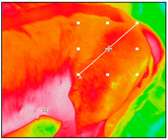 Images were obtained by each anatomical region immediately before (T0), at the end (T1), and 60 s after the end of Tecar therapy (T2). The distance between the dog and the camera was 40 cm: the procedure did not entail any constrictive or invasive maneuver that could affect the animal’s well-being. The images were acquired by a camera display. Data (images) were recorded and analyzed with Inf Rec Analyzer NS9500 Lite software (Nippon Avionics Co.LTD, Yokohama-Shi, Japan). Squared or rectangular shaped regions (areas) of interest (ROIs) were defined within each image. Areas were selected on the basis of the area of application of the Tecar therapy probe following the clinical evaluation and the diagnostic imaging. For each area, maximum, minimum, and mean temperatures were extrapolated at T0, T1, and T2. The same data were further obtained by the diagonal (line) of each single area (Figure 1). Profile and thermal diagrams were also recorded.