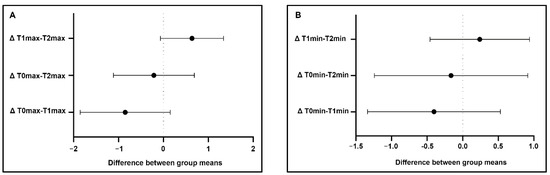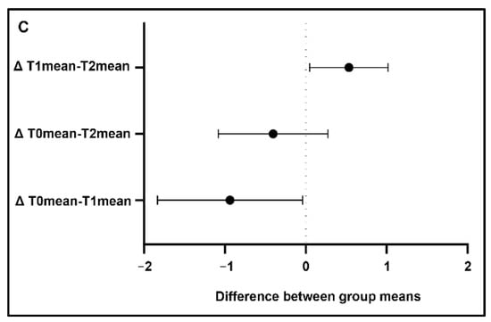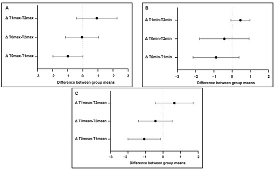 Maximum (A), minimum (B) and mean (C) temperature differences in the areas: the intersection with the dotted line identifies “not statistical significance”. The mean temperature differences T0–T1 and T1–T2 are significant (C). Δ = temperature difference in °C.