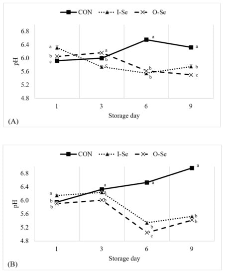 pH of the meat samples over the storage period is presented in Figure 1A. There was a significant treatment effect (p < 0.05) for pH on each storage day. The most meaningful difference in pH of the meat samples was observed on day-6 and day-9 of the storage period where the pH of geese fed CON was greater than pH of geese supplemented I-Se and O-Se. pH of the liver over the storage period is presented in Figure 1B. Similar to the observations for meat samples, the most meaningful difference in pH of the liver was observed on day-6 and day-9 of the storage period where the pH of geese fed CON was greater than pH of geese supplemented I-Se and O-Se. It is well established that microbial growth during storage can affect pH [56,57], and data from the current study indicate that meat and liver samples from geese supplemented with selenium (both I-Se and O-Se) may behave differently in terms of their microbial stability.