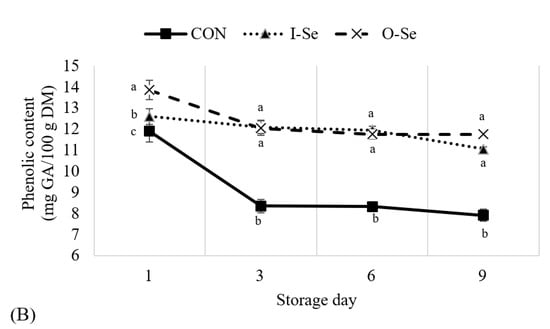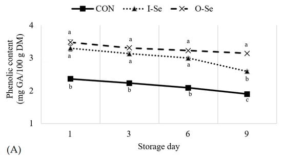 Effects of dietary supplementation with inorganic or organic selenium on the phenolic content for goose meat (equal portions of the breast and thigh meat) (A) and liver (B) during 9 days of storage at 4 °C. Treatments were defined as CON: basal diet without supplemental selenium; I-Se: basal diet with 0.3 mg/kg inorganic selenium; O-Se: basal diet with 0.3 mg/kg organic selenium. Means within the same day with differing letters are different (p < 0.05).