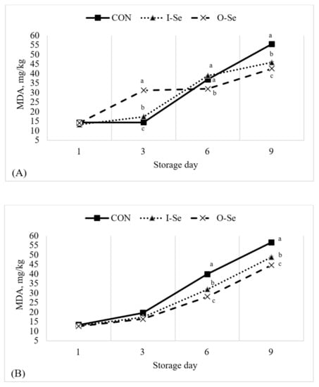 Effects of dietary supplementation with inorganic or organic selenium on the thiobarbituric acid reactive substances (TBARS) for goose meat (equal portions of the breast and thigh meat) (A) and liver (B) during 9 days of storage at 4 °C. Treatments were defined as CON: basal diet without supplemental selenium; I-Se: basal diet with 0.3 mg/kg inorganic selenium; O-Se: basal diet with 0.3 mg/kg organic selenium. Means within the same day with differing letters are different (p < 0.05).