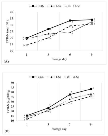 Effects of dietary supplementation with inorganic or organic selenium on the total volatile basic nitrogen (TVB-N) for goose meat (equal portions of the breast and thigh meat) (A) and liver (B) during 9 days of storage at 4 °C. Treatments were defined as CON: basal diet without supplemental selenium; I-Se: basal diet with 0.3 mg/kg inorganic selenium; O-Se: basal diet with 0.3 mg/kg organic selenium. Means within the same day with differing letters are different (p < 0.05).
