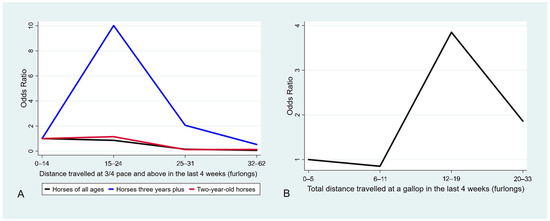The effect of high-speed exercise history on musculoskeletal injury in Thoroughbred racehorses in South-East Queensland, Australia. (A) The effect of increasing distance travelled at three-quarter pace and above (faster than 13 m/s; 15 s/furlong; 800 m/min; 48 km/h) on musculoskeletal injuries (MSI) in horses of all ages, two-year-old horses and horses three years and older. (B) The effect of increasing distance travelled at a gallop (faster than 15 m/s; 13 s/furlong; 900 m/min; 55 km/h) on MSI in horses of all ages. Results shown are from multivariable conditional logistic regression analyses for 202 cases of musculoskeletal injury and 202 controls matched by trainer and age. Significance was set at α = 0.05.