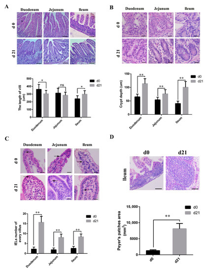 There are two major transitional periods during the development of the intestinal immune system in pig; one at birth and the other at weaning [10,11]. The porcine intestinal immune system is immature at birth [12], and thus, piglets are most susceptible to pathogenic organisms during the neonatal stage [13]. Today, the weaning age of pigs has declined [14], and it has been reported that weaning of Wuzhishan piglets at 21 days of age may have positive effects on the adaptive immune system [15]. Previous studies have investigated the quantitative changes in the two main stem cell populations in the small intestines of 0- and 21-day-old piglets [16]; however, differences in morphology and immunological components of small intestines between neonatal and weaned piglets remain unknown. Therefore, in this study, we compared the physical and immunological differences of the small intestines between neonatal (0 day) and weaned piglets (21 days) to provide preliminary data for future mechanistic and developmental studies.