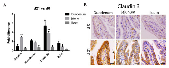 Tight junctions, important determinants of epithelial barrier functions, are regulated by occludin, claudin, E-cadherin, and the zonula occludin (ZO) family [26]. Consequently, we compared the expression of genes coding for tight junction proteins in various areas of the small intestine between the neonatal and weaned piglets. As shown in Figure 2A, compared with that in neonates, the expression of claudin and occludin transcripts in the intestinal mucosa was significantly higher in weaners, while that of E-cadherin and ZO-1 was similar. We stained tissue sections with anti-claudin-3 antibodies to further compare the expression of tight junction proteins in various gut areas between the neonates and weaners and found that the expression of claudin-3 proteins was higher in weaners than in neonates, especially in the duodenum (Figure 2B).