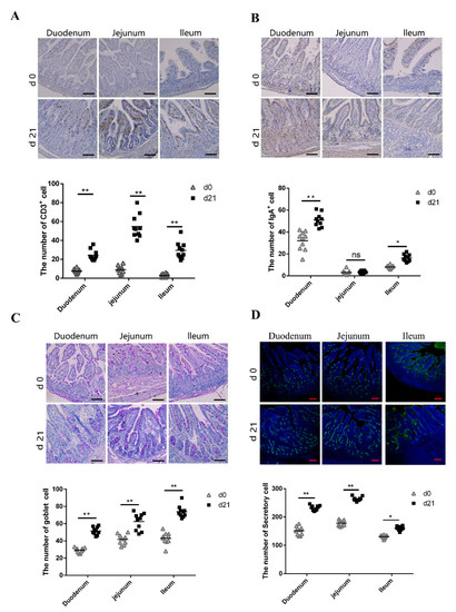 Expression of CD3+ T cells, SIgA-positive cells, goblet cells, and secretory cells in small intestines. (A–C) Immunohistochemical staining of CD3+ T cells, SIgA-positive cells, and goblet cells. ns: not significant. (D) Immunofluorescent staining of secretory cells in pig small intestine. Positive cells were quantified using densitometry analyses and were calculated in ten random fields. (n = 10 per group). Scale bars: 100 μm. * 0.01 < p < 0.05 and ** p < 0.01.