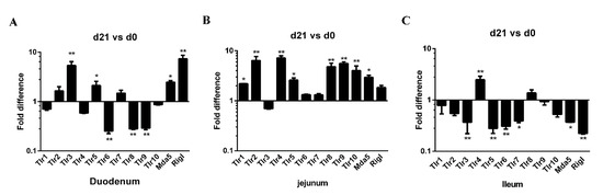 Differences in mRNA expression of PRR genes in neonatal and weaned piglet small intestines. (A–C) The mRNA levels of TLR1, TLR2, TLR 3, TLR4, TLR5, TLR6, TLR7, TLR8, TLR9, TLR10, MDA5, and Rig-I in the intestinal mucosa was determined in each animal using a SYBR-green qRT-PCR. All samples were tested in triplicate and the results are expressed as fold changes relative to the control animals. * 0.01 < p < 0.05 and ** p < 0.01.