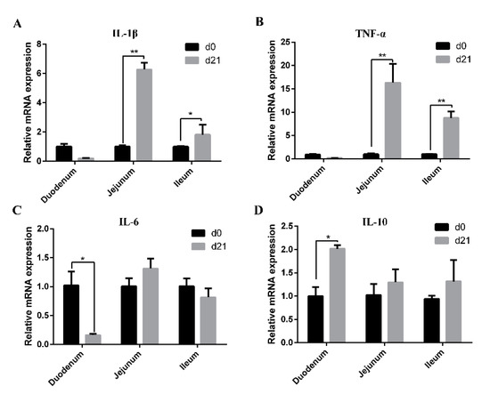 The mRNA expression levels of IL-1β, TNF-α, IL-6, and IL-10 in the intestinal mucosa of neonatal and weaned piglets are shown in Figure 5. Compared with those in neonatal piglets, mRNA levels of IL-1β and TNF-α in jejunal and ileal mucosa as well as IL-10 in the duodenal mucosa were higher in weaned piglets (Figure 5A,B,D), while the mRNA level of IL-6 in duodenal mucosa was significantly decreased (Figure 5C).