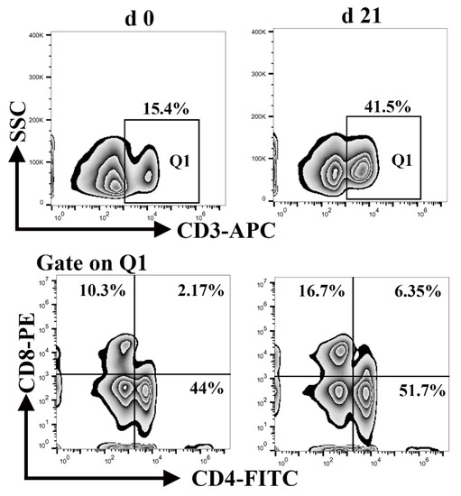 Isolated single mononuclear cells were obtained from the piglet PBMCs by density centrifugation using a porcine peripheral blood lymphocyte separation kit (Solarbio, Dalian, China). PBMCs were stained with anti-CD3-APC (BD Biosciences, San Diego, CA, USA), anti-CD4-FITC (BD Biosciences, San Diego, CA, USA), and anti-CD8-PE (BD Biosciences, San Diego, CA, USA) (1:100 dilution) for 30 min at 4 °C in the dark. The cells were then washed twice with PBS, and the expression of surface markers was observed using flow cytometry. The flow cytometry data were analyzed using the FlowJo software. A total of 10,000 lymphocytes were acquired per sample.