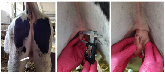 An eighteen-month-old Holstein–Friesian heifer was subjected to clinical examination due to abnormal development of the external genitalia (Figure 1). The vulva, located abdominally, had a small clitoris and underdeveloped labia. The opening of the urethra was palpated inside the vulva. The permeability of the vagina, approximately 30 cm in length, was observed by inserting an insemination catheter. Rectal examination revealed a normally developed uterus and gonads resembling ovaries. The heifer displayed typical heat symptoms, such as bellowing, restlessness, and trailing. Ultrasound examinations revealed active ovaries with a large ovarian follicle (approximate diameter 17 mm). Concentrations of steroid hormones in serum were as follows: 0.04 µg/L (estradiol) and 0.07 µg/L (testosterone).