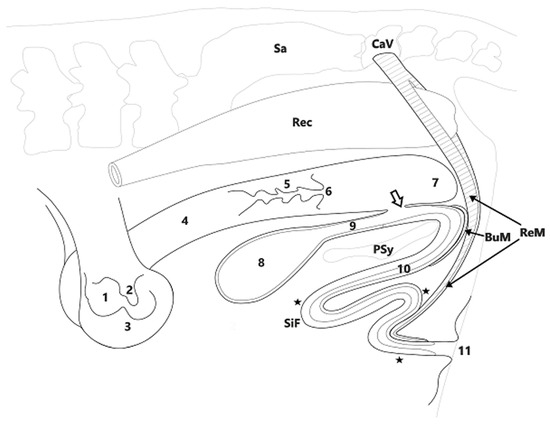 The urogenital system of the studied heifer. Abbreviations: Sa: sacral bone; CaV: caudal vertebrae; Rec: rectum; PSy: pelvic symphysis; BuM: bulbospongiosus muscle; ReM: retractor muscle of penis; SiF: sigmoid flexure; 1: ovary; 2: fallopian tube; 3: horn of uterus; 4: body of uterus; 5: uterine cervix; 6: external orifice of uterus; 7: blind-ended vestibule of the vagina; 8: urinary bladder; 9: female urethra; 10: male urethra included in penis; 11: external urethral orifice and deformed vulva. White arrow: the beginning of male urethra; asterisks: histological evaluation sites.