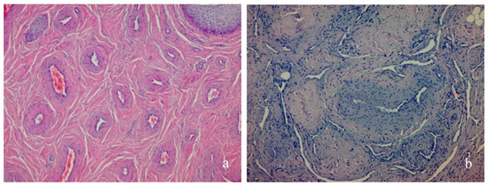 Histological features of the urethra: (a) spongial body with irregular blood vessels in fibrous collagen stroma; (b) cavernous body with helicine arteries and irregular slit-like vessels alternating with branches of coarse fibrin collagen, hematoxylin and eosin (H&E) staining.