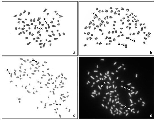 Chromosome preparations were obtained from in vitro leukocyte and fibroblast cultures. The cells were cultured using RPMI-1640 medium (Sigma-Aldrich Inc., St. Louis, MO, USA) or Dulbecco’s modified Eagle’s medium (DMEM) (Sigma-Aldrich Inc., St. Louis, MO, USA), supplemented with 15% (v/v) fetal calf serum, and 1% (v/v) penicillin/streptomycin and phytohemagglutinin (in case of leukocyte culture) at 37 °C in a humidified atmosphere of 5% CO2. After colcemid treatment, the standard harvesting procedure with hypotonic and fixative steps was used. Chromosomes were analyzed using Giemsa, DAPI (4’,6-diamidino-2-phenylindole), and C-band staining techniques. Bovine sex chromosomes were identified based on their bi-armed morphology and characteristic banding pattern after C-banding. The slides were examined with an epifluorescence Nikon E600 Eclipse microscope ( (Melville, NY, USA) equipped with a cooled CCD digital camera (Melville, NY, USA) and Lucia software (Laboratory Imaging, Ltd., Prague, Czech Republic).