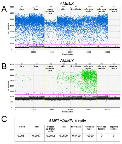 Detection of AMELX (A), AMELY (B) genes by droplet digital polymerase chain reaction (ddPCR) and the ratio between number of copies, AMELY/AMELX (C).