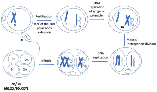 Mixoploidies (2n/3n) can occur in a form of mosaicism (where cell lines originate from a single zygote) or chimerism (where the lines are derived from different zygotes), and the additional genome can have a parental or maternal origin. Mixoploidy can be caused by: (a) delayed extrusion of the second polar body, followed by aberrant segregation of the entire parental genome into blastomeres during early embryonic mitoses; (b) fertilization by two sperms, followed by the fusion of one male pronucleus with the female pronucleus in a zygote and delayed fusion of the second male pronucleus with diploid nucleus of a daughter blastomere; or (c) the fusion of diploid and triploid embryos [12]. It is worth mentioning that cytogenetic analysis of mixoploid human patients, on the basis of in vitro cultured leukocytes, has usually revealed a normal diploid karyotype or a very low proportion of triploid metaphase spreads. On the other hand, the incidence of the triploid cell line has been found to be elevated in in vitro cultured fibroblasts [13,14].