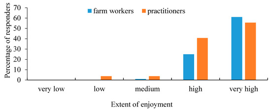 Extent of the veterinary practitioners’ (n = 27) and farm workers’ (n = 429) enjoyment from their work on the farm. There were statistical differences between groups.