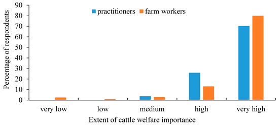 Importance of cattle welfare as perceived by veterinary practitioners (n = 27) and farm workers (n = 429). There were statistical differences between groups.