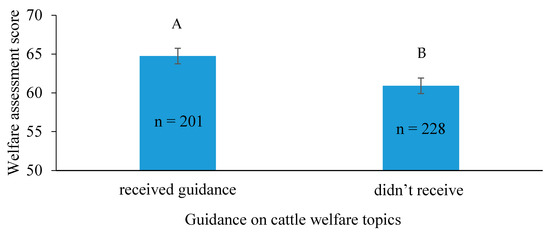 Effect of animal welfare guidance on farm workers’ (n = 429) knowledge (p = 0.02), as expressed by the welfare assessment scores, presented as least squares (LS) means ± SE. Letters “A” and “B” signify statistical differences between groups.