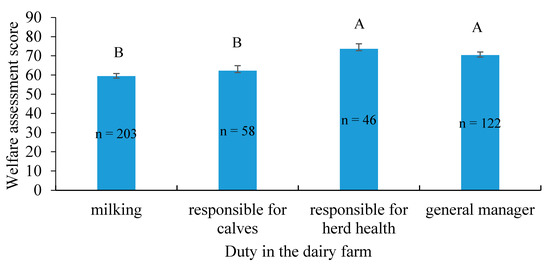 Welfare assessment score (LS mean ± SE) for individuals with different duties on the dairy farm (n = 429; p = 0.02). Letters “A” and “B” signify statistical differences between groups.