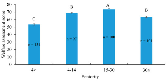 Effect of farm workers’ seniority (years of experience in farming) on their knowledge of animal welfare, as expressed by the welfare assessment score. Values are presented as LS mean ± SE (n = 429; p < 0.0001). Letters “A”, “B” and “C” signify statistical differences between groups.