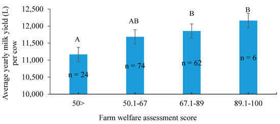 The higher-producing dairy farms had a higher mean FWAS (Figure 6). Farms that scored under 50 on the survey had a mean annual milk yield of 11,167 ± 250 L/cow, whereas farms scoring 89–100 had a mean yearly milk yield of 12,162 ± 259 L/cow. No effect of FWAS was seen on milk fat or protein content, or on somatic cell count.