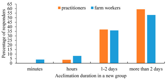 The distribution of the farm workers’ (n = 478) and practitioners’ (n = 27) assessment of required acclimation duration in a new group of unfamiliar cows. There were no statistical differences among groups.