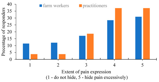 Veterinary practitioners’ and farm workers’ results are given in Table 1 and Table 3, respectively, demonstrating some small differences (that even if not statistically different are worth mentioning). The perception of pain expression in cows is demonstrated in Figure 8.
