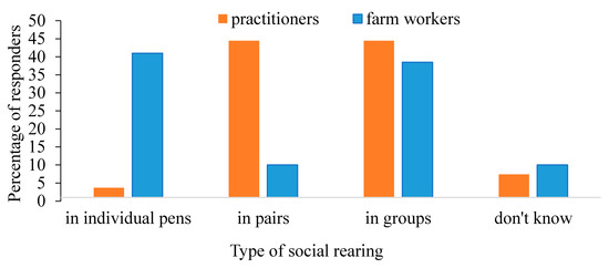 Distribution of practitioners’ (n = 27) and farm workers’ (n = 482) opinions regarding the preferred type of social rearing of pre-weaned calves (up to 2 months of age). There were no statistical differences among groups.