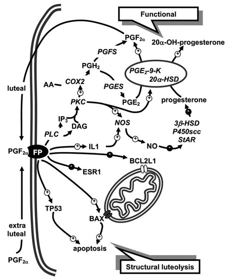 Schematic model reporting the functional (upper) and structural (lower) luteolytic pathways induced by prostaglandin F2 α (PGF2α) in rabbit mid-corpora lutea (CL) (day 9 of pseudopregnancy). Since prostaglandin E2 (PGE2)-9-K and 20α-hydroxysteroid dehydrogenase (HSD) represent two different activities of a single enzyme, they are joined. Figure from the study by Maranesi et al. 2010 [31]. For acronyms, see the list of abbreviations in the text.
