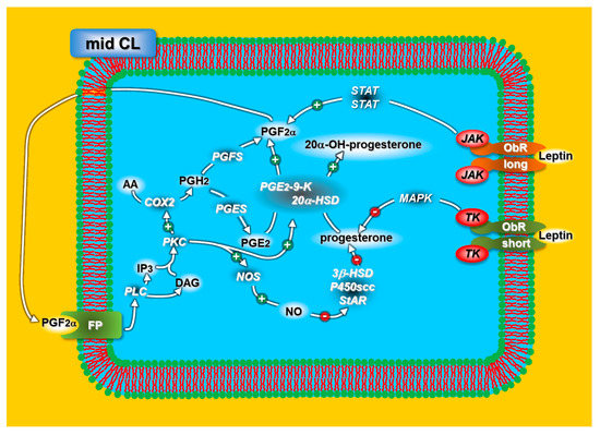 Our studies on rabbit CL [80] show that leptin affects progesterone and PGF2α release with different intracellular signaling pathways through different receptors (long ObR and short ObR). More specifically, leptin inhibits progesterone release through the MAPK cascade (short ObR) and stimulates PGF2α release through the JAK pathway (long ObR) (Figure 2).