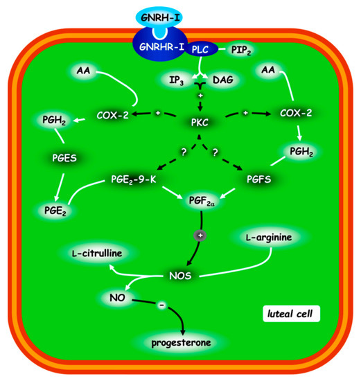 The studies conducted in our laboratory [85] highlighted that the autocrine, paracrine and/or endocrine roles of GnRH type I (GnRH-I) directly diminished the progesterone secretion in rabbit CL that had acquired luteolytic competence (Figure 3): GnRH-I acts via GnRHR-I by activating phospholipase C (PLC) and stimulating the inositol trisphosphate (IP3) and diacylglycerol (DAG) pathways. Through the activation of protein kinase C (PKC), these two intracellular messengers stimulate COX2 activity and PGF2α release. This PG induces (via paracrine, autocrine and/or intracrine mechanisms) an increase in NOS activity and NO levels [11], which downregulates the progesterone levels [18,31] (Figure 1, upper, functional luteolysis).